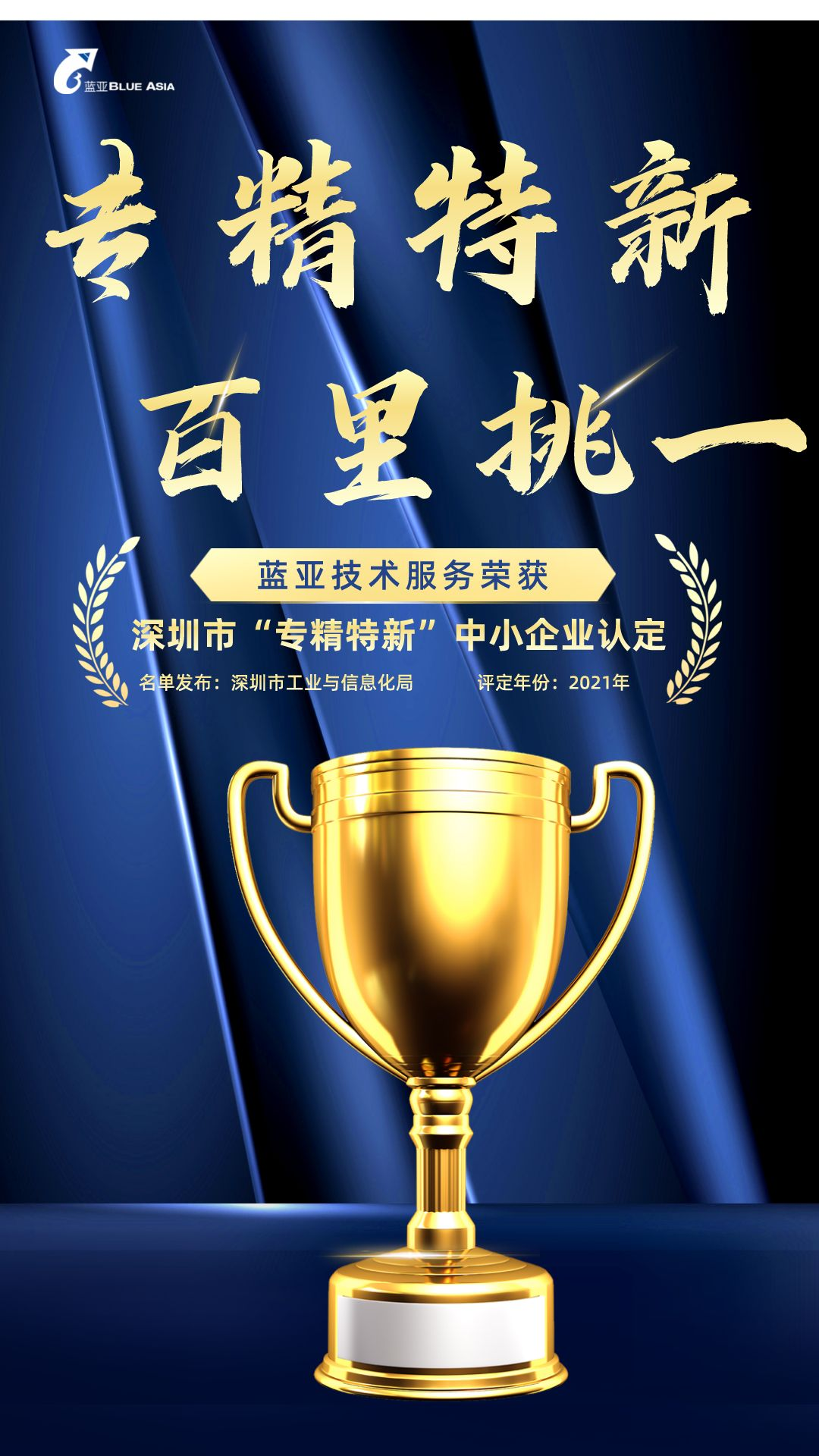 热烈祝贺“蓝亚技术服务(深圳)有限公司”评定为2021年度市级“专精特新”中小企业认定 深圳市专精特新企业认定介绍: 2021年7月30日,政治局会议首次将「发展专精特新中小企业」,上升至国家层面。相关配套政策有望降低中小企业创新成本,推动中小企业进入发展的快车道,尤其是长期专注于中高端制造细分领域,有望突破关键.....